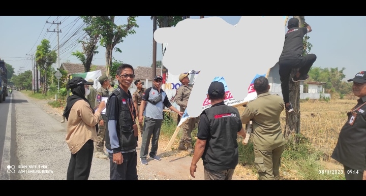 Pasuruan_Lumbung-berita.com Panwascam Wonorejo melakukan penertiban Alat Peraga Kampanye (APK) dan Alat Peraga Sosialisasi (APS), yang melanggar aturan PKPU 15 Tahun 2023 dan Perbub No 30 Tahun 2018 di wilayah Kecamatan Wonorejo Kabupaten Pasuruan, Rabu (8/11/2023). Penertiban dilakukan bersama dengan Satpol PP Kabupaten Pasuruan, Kasie Trantib juga PKD se-Kecamatan Wonorejo serta pihak Kepolisian Wonorejo. Nahrowi,