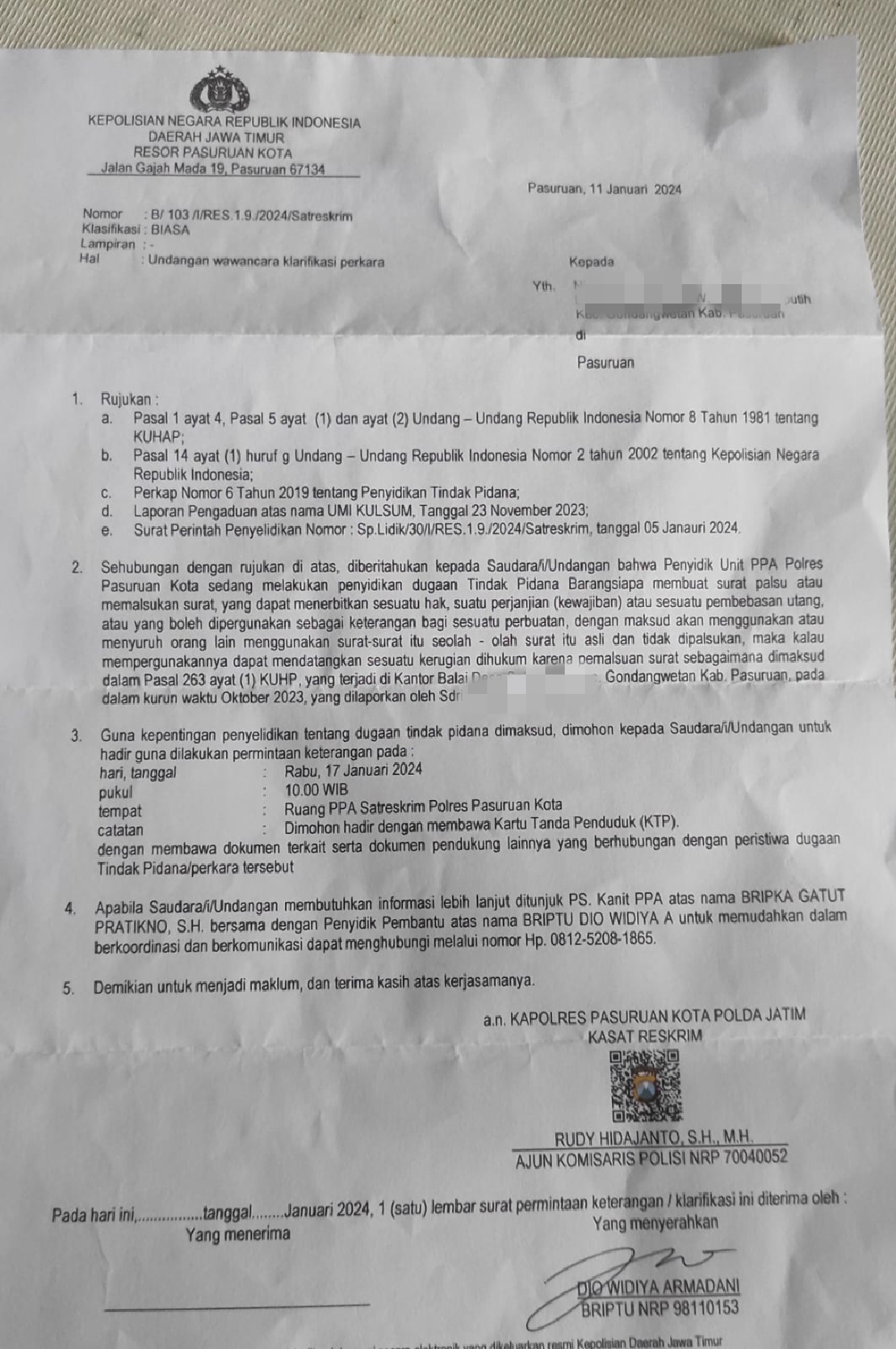 Pasuruan_Lumbung-berita.com Nasib kurang baik dialami inisial NH, Warga Desa Sekarputih, Kecamatan Gondang Wetan, Kabupaten Pasuruan. Dia (NH) di adukan oknum Sekretaris Desanya. NH yang juga menjabat ketua Rt 01 Rw 01 tersebut diadukan ke Polresta Pasuruan oleh Umi Kulsum, yang merupakan Sekdes Sekarputih. Pengaduan di layangkan pada 23 November 2023, NH diduga melakukan pemalsuan dokumen.